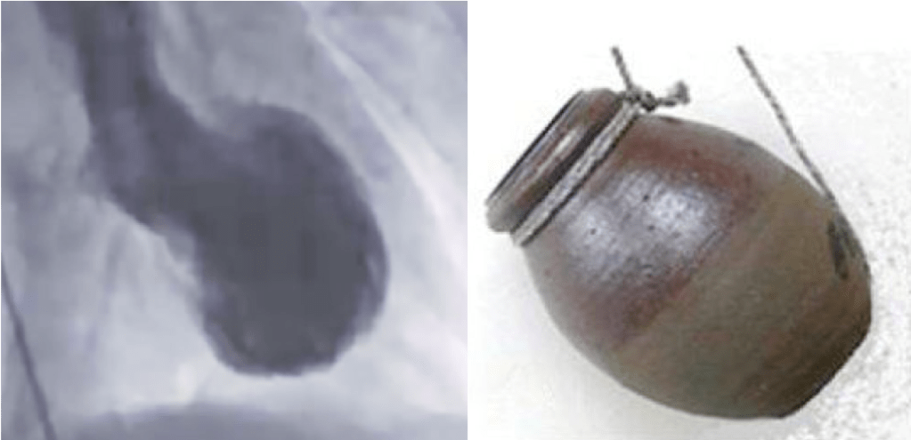Curiosamente, de la similitud entre la imagen ventriculográfica de un abombamiento apical y un takotsubo* le viene el nombre a este síndrome.