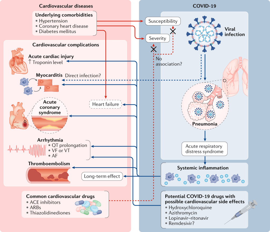 Varios trabajos recientes publicados en Circulation, JAMA y Nature Reviews Cardiology analizan la relación entre el SARS-CoV-2 y la enfermedad cardiovascular, y lo hacen en dos direcciones: por un lado, estudiando la prevalencia de factores de riesgo cardiovascular en los pacientes COVID-19 y su trascendencia en el pronóstico de la viriasis; y por otro lado, desglosando las cardiopatías inducidas directamente por el propio virus.