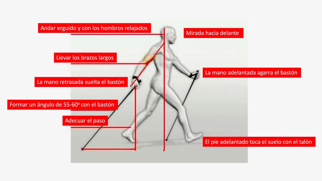 Idealmente, los bastones deben incorporar unas «dragoneras» (una especie de guante) que permiten que el bastón se mueva libremente sin caerse de la mano. Generalmente están fabricados en fibra de carbono, un material ligero y a la vez resistente. La técnica más habitual es la conocida como «técnica diagonal», en la que se apoya el bastón del brazo contralateral a la pierna adelantada y siempre por detrás del talón del pie adelantado, lo cual nos permite realizar un trabajo activo completo con ambos pies. En cuanto a la postura y al desplazamiento de los bastones, una de las técnicas más empleadas y que más beneficios saludables aporta es la técnica ALFA 247, la cual consiste en: andar erguidos, llevar los brazos largos (realizar movimientos amplios con ellos sin que estén rígidos), formar un triángulo (el bastón no cae de cualquier manera en el suelo, sino que debe formar un ángulo de 60 grados aproximadamente) y adecuar la longitud del paso al terreno y a la situación en la que nos encontremos.