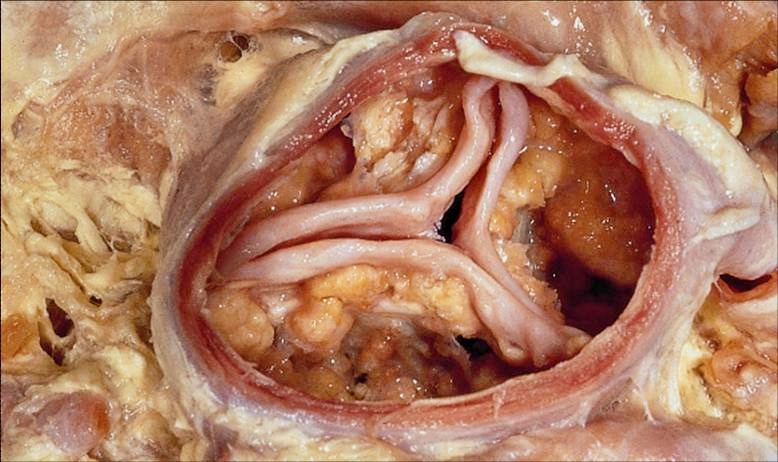 Aspecto real de una válvula aórtica con estenosis degenerativa calcificada.