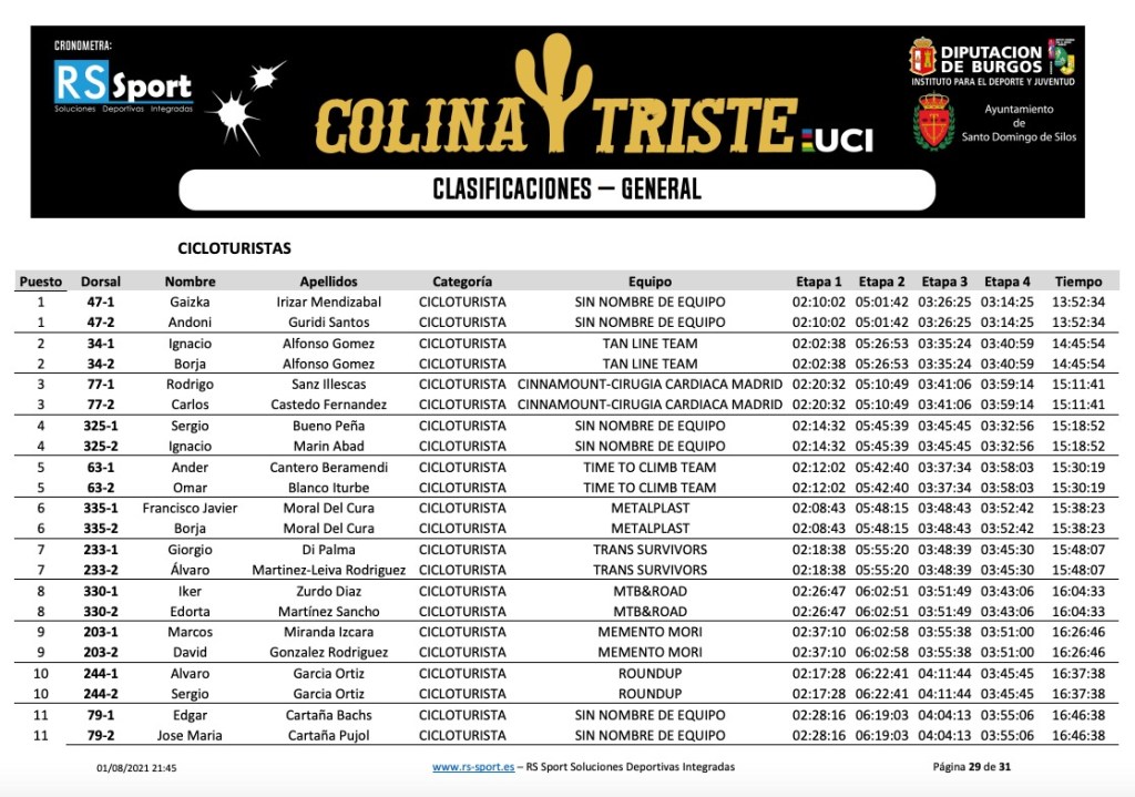 El equipo de ciclismo de montaña CINNAMOUNT CIRUGÍA CARDIACA MADRID ha obtenido la medalla de bronce en la prueba ciclista Colina Triste UCI S1 2021 modalidad cicloturista.