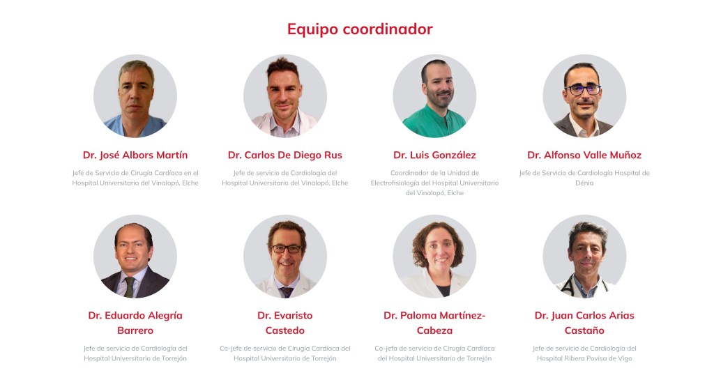 El equipo multidisciplinar está formado por especialistas en Cardiología, Cirugía Cardíaca, Arritmias, Rehabilitación cardíaca, Hemodinámica, y Anestesiología y Reanimación de los Hospitales Universitarios de Torrejón y Vinalopó, Denia y Povisa-Vigo.