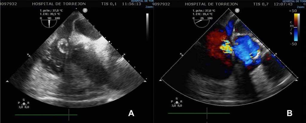 El caso publicado hace referencia a un varón de 68 años, portador de una valvulopatía aórtica moderada en seguimiento y antecedentes de una neurocirugía reciente para resección de una malformación arteriovenosa cerebral, que ingresó en la UCI de nuestro hospital con el diagnóstico de endocarditis infecciosa de la válvula aórtica por Staphilococcus aureus meticilin-resistente. El paciente estaba en situación de parada cardiorespiratoria en el contexto de un bloqueo aurículo-ventricular completo, lo que obligó a la implantación de un marcapasos transitorio. Posteriormente sufrió una crisis tónico-clónica, que obligó a su intubación oro-traqueal. El ecocardiograma demostró la existencia de una insuficiencia aórtica masiva, por lo que se sometió a un reemplazo valvular aórtico emergente. La evolución postoperatoria fue buena, pero una semana después, en un eco de control, se detectó una masa en la aurícula derecha asociada a una comunicación tipo Gerbode directo o supravalvular. Inicialmente se decidió manejo conservador, pero a los 15 días del diagnóstico, coincidiendo con un claro empeoramiento clínico, se objetivó importante aumento del cortocircuito intracardiaco, por lo que el paciente se sometió a una nueva cirugía para corrección quirúrgica del defecto mediante cierre del orificio de salida en la aurícula derecha. El eco de control post-cirugía mostró una prótesis aórtica normofuncionante, ausencia de shunt residual y una válvula tricúspide competente. La evolución posterior discurrió sin incidencias y el paciente fue dado de alta al finalizar el tratamiento antibiótico.
