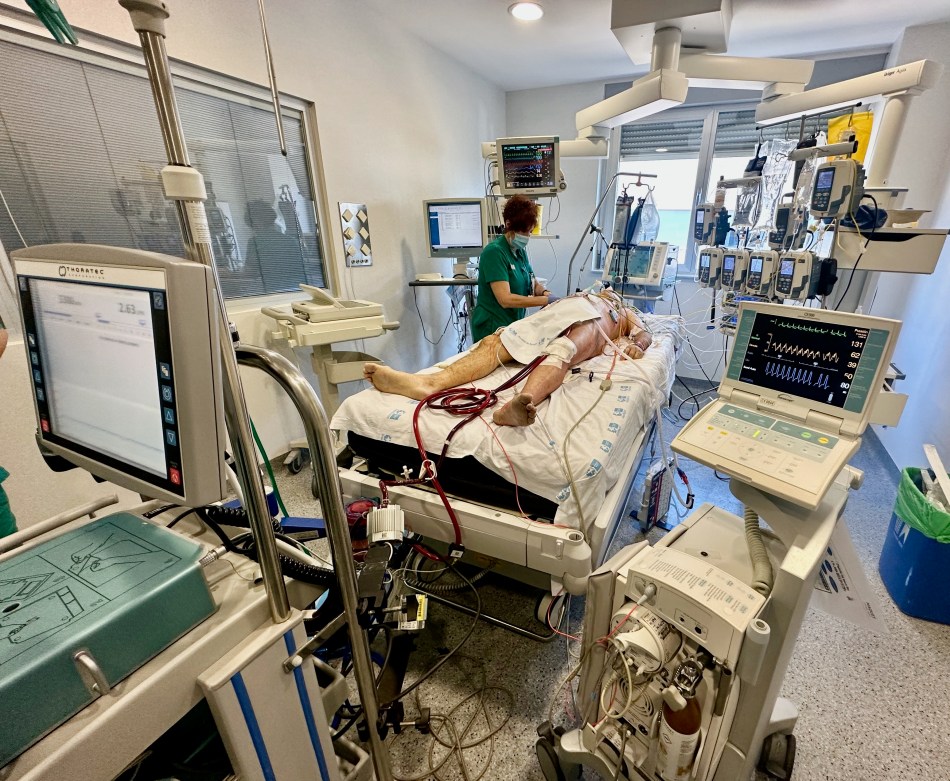 El dispositivo fue implantado por el Servicio de Cirugía Cardiaca en un varón de 63 años que presentó una hipoxemia severa tras ser operado de corazón. El paciente había acudido al hospital traído por el SUMMA con un cuadro sugestivo de infarto agudo de miocardio. A su llegada estaba en situación de shock cardiogénico y edema agudo de pulmón severo, lo que motivó su intubación orotraqueal, el implante de un balón de contrapulsación intraórtico y su ingreso en UCI. En el ecocardiograma se observó una insuficiencia mitral severa por prolapso masivo del velo posterior (secundario a arrancamiento del músculo papilar posteromedial). El cateterismo demostró una enfermedad de 2 arterias coronarias (descendente anterior y diagonal). Dada su inestabilidad, se decidió intervención quirúrgica emergente, implantándose una prótesis mitral mecánica y realizándose un bypass coronario con arteria mamaria a la DA. A la salida de circulación extracorpórea, el paciente presentó una hipoxemia grave a pesar de una buena función cardiaca, por lo que se procedió al implante de un ECMO veno-arterial por vía femoral. Tras ser estabilizado en la UCI, se procedió a trasladarlo a la Unidad de Medicina Intensiva Cardiológica (MICA) del Hospital Universitario 12 de Octubre para continuar su tratamiento, presentando una evolución lenta pero favorable.