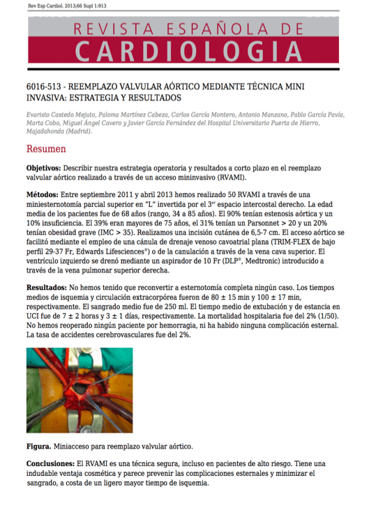 Castedo E, Martínez Cabeza P, Montero CG, et al. Reemplazo valvular aórtico mediante técnica mininvasiva: estrategia y resultados. SEC 2013 – El Congreso de las Enfermedades Cardiovasculares; 2013 Octubre; Valencia.