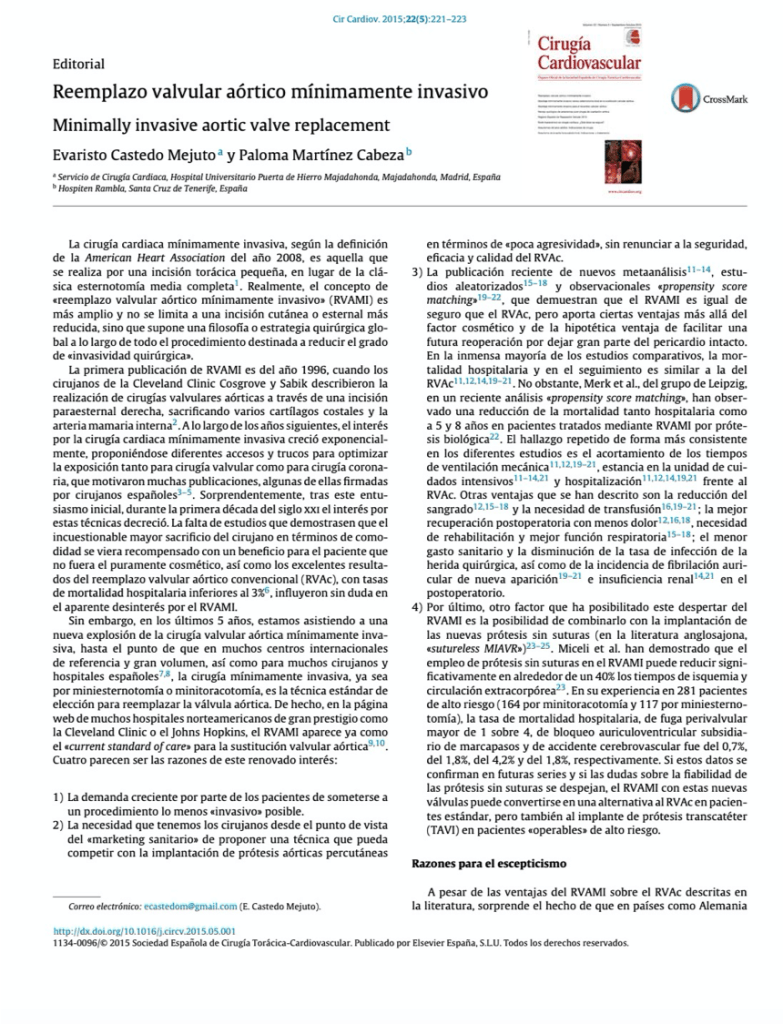 Castedo E, Martínez Cabeza P. Reemplazo valvular aórtico mínimamente invasivo. Cirugía Cardiovascular 2015;22(5):221-223.
