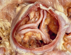 Estenosis y calcificación de una válvula aórtica.